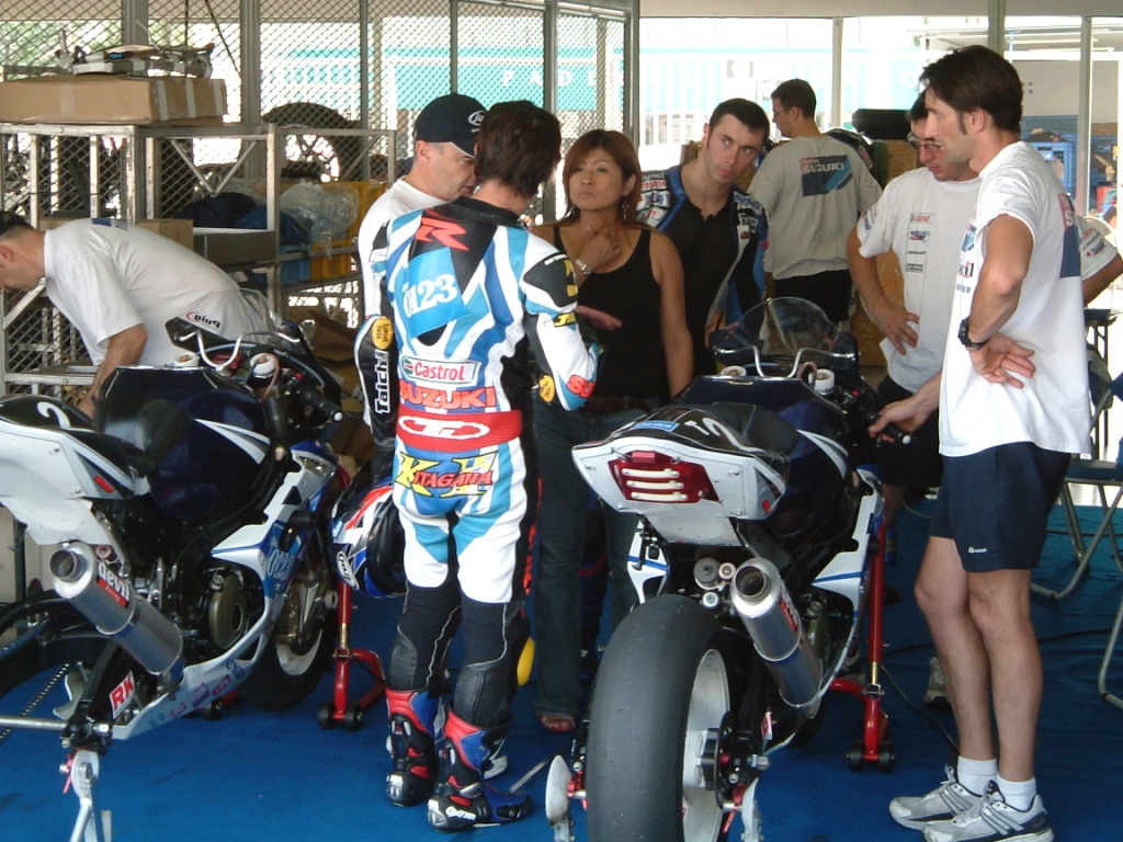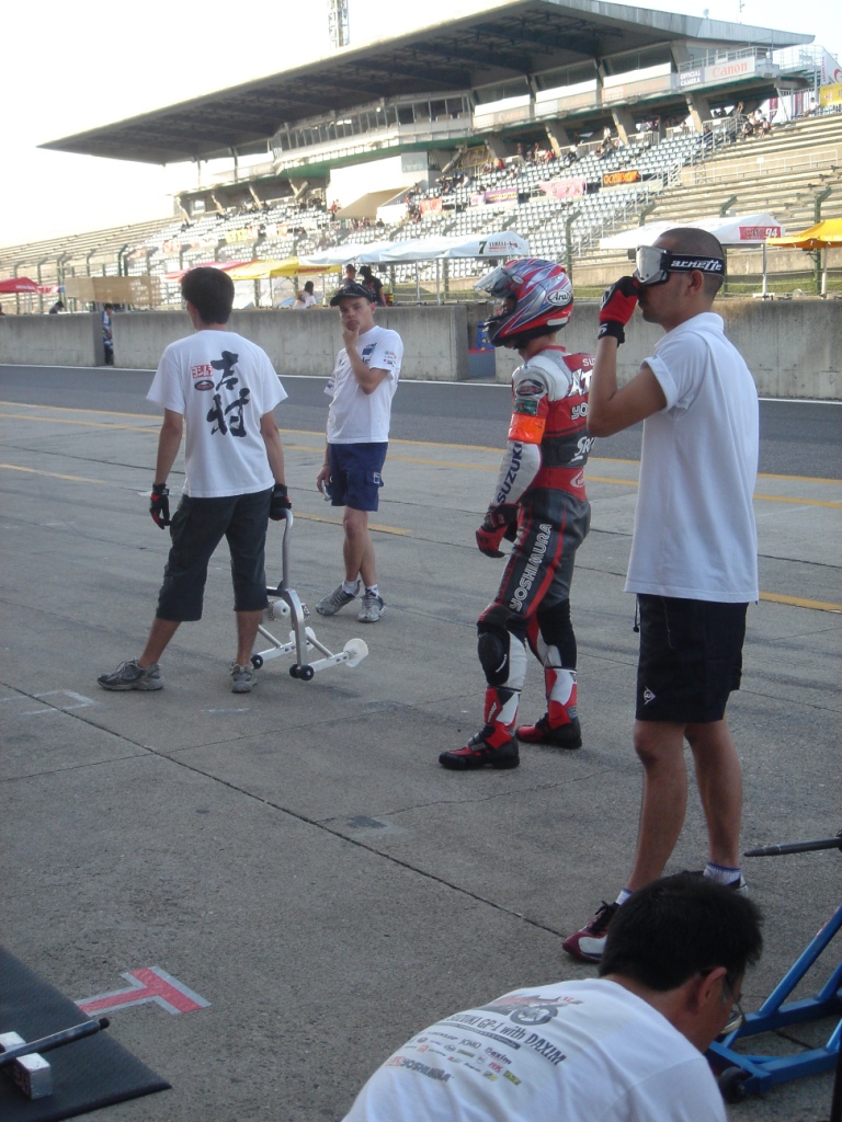 実際、加賀山選手はかなり鈴鹿を走りこんでいて、鈴鹿をレースで普段走らないSBKワークスマシンを持ち込んでテストをやっていた位ですので、ほとんどスズキワークス全面バックアップの状態での8耐参戦が伺えました。(噂ですが、スズキワークステストライダーの秋吉選手が事前テストでダンロップレースタイヤで8秒2まで出たいう話も聞きました)